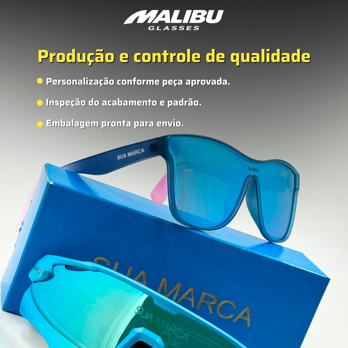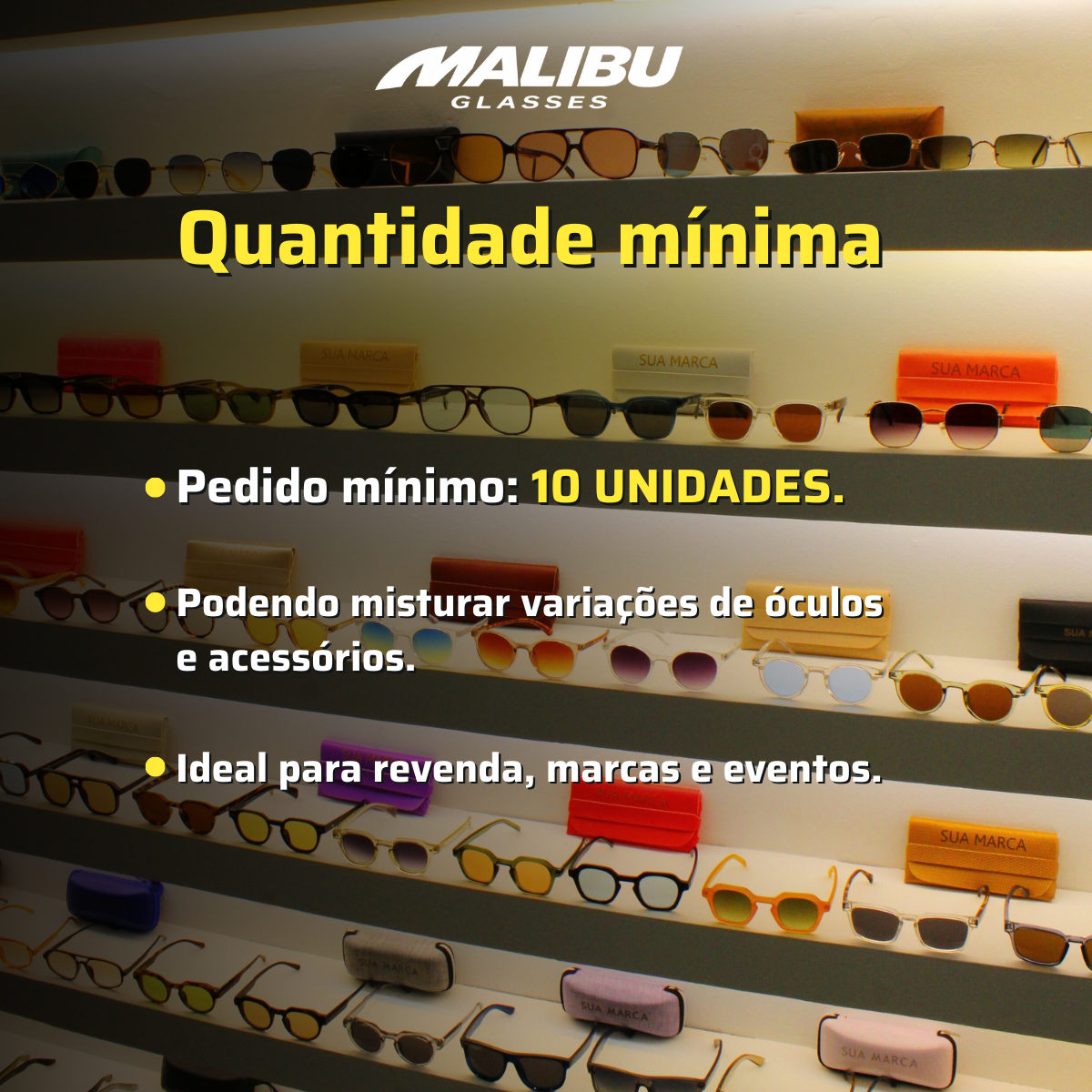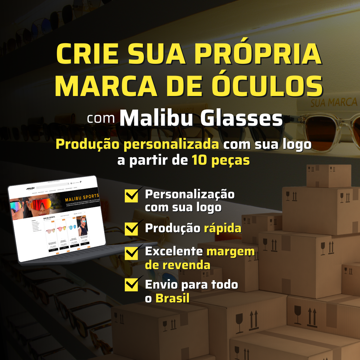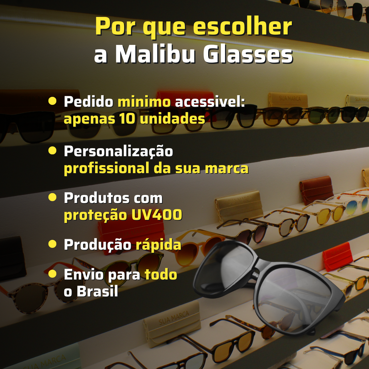 A Malibu Glasses oferece produção personalizada com a sua logo a partir de apenas 10 unidades, ideal para quem deseja iniciar uma marca própria ou ampliar o portfólio de produtos.