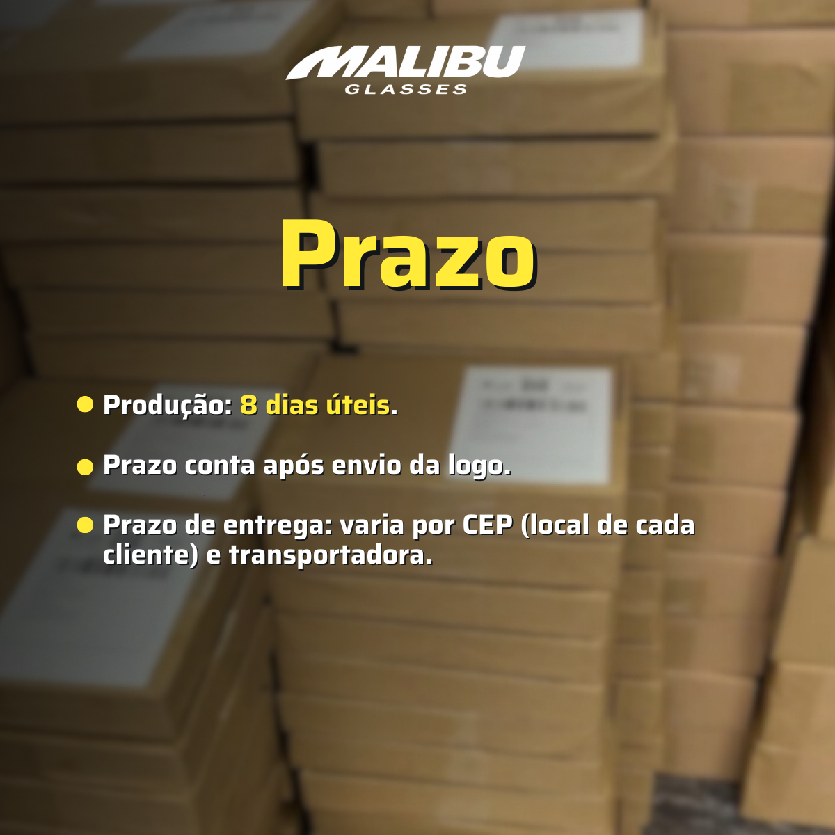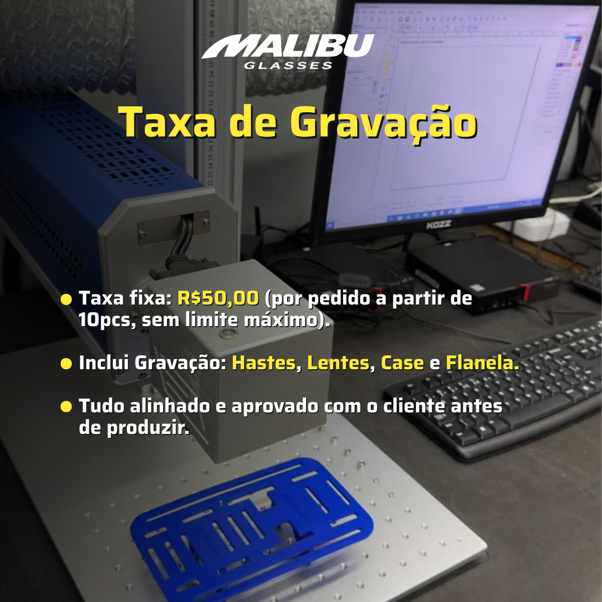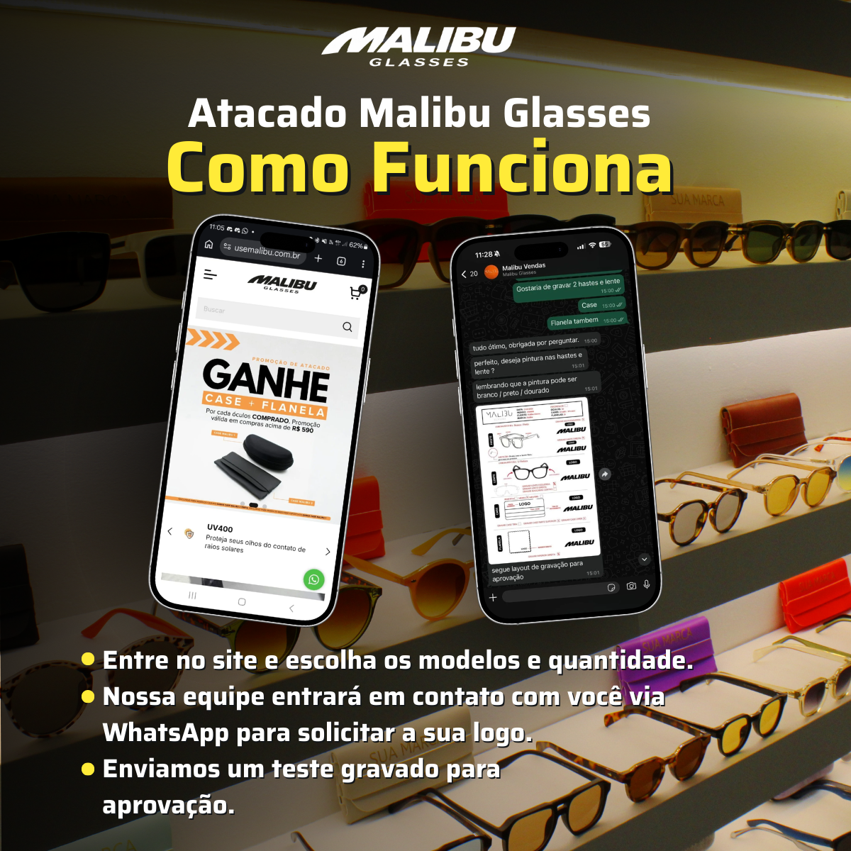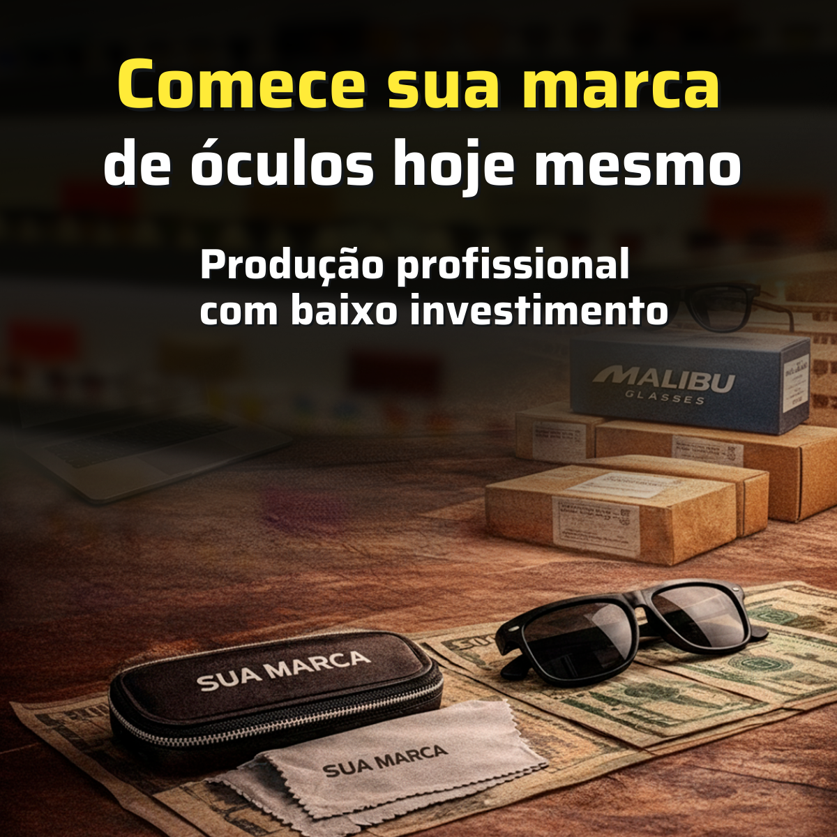 A Malibu Glasses oferece produção personalizada com a sua logo a partir de apenas 10 unidades, ideal para quem deseja iniciar uma marca própria ou ampliar o portfólio de produtos.