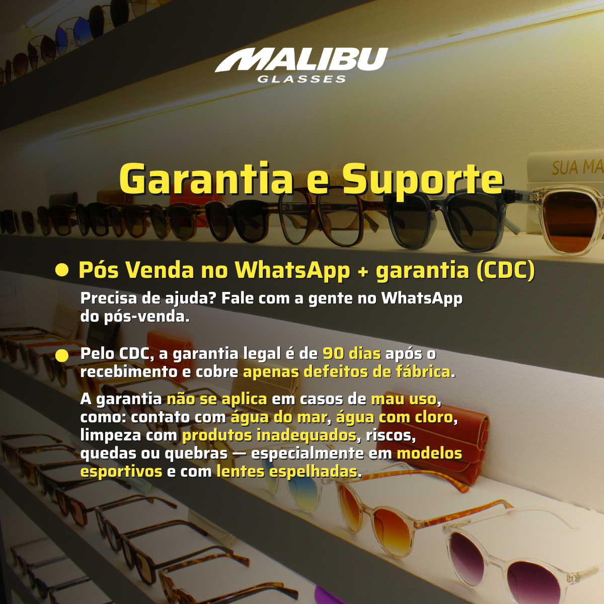 A Malibu Glasses trabalha com produtos de qualidade, lentes com proteção UV400, personalização profissional e produção ágil.