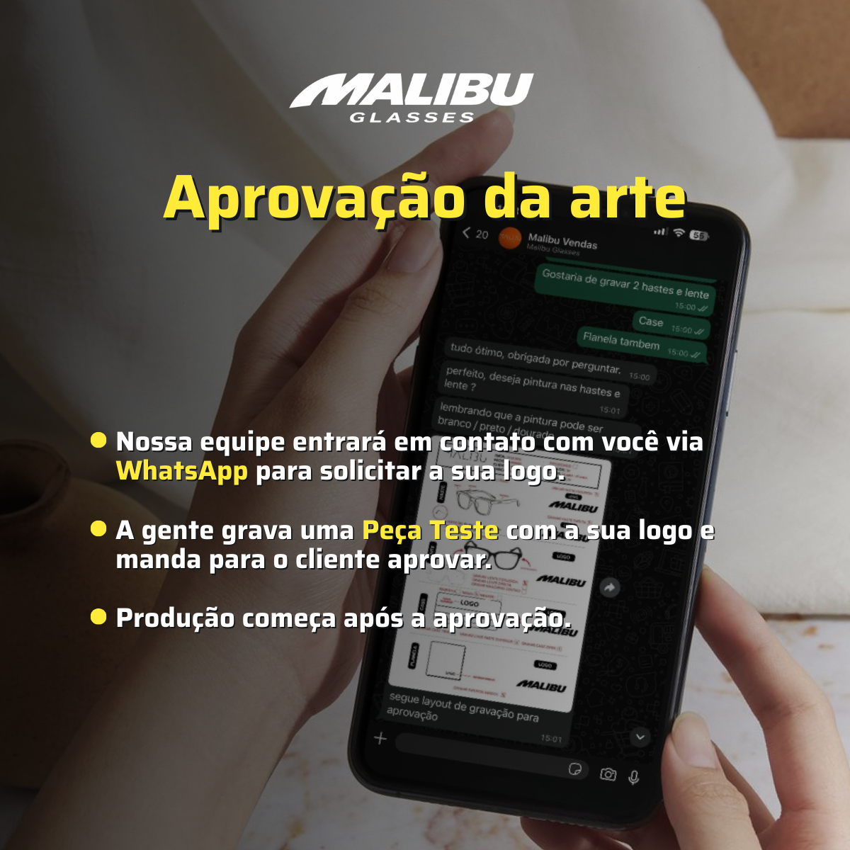 A Malibu Glasses oferece produção profissional, pedido mínimo acessível e suporte completo durante todo o processo.