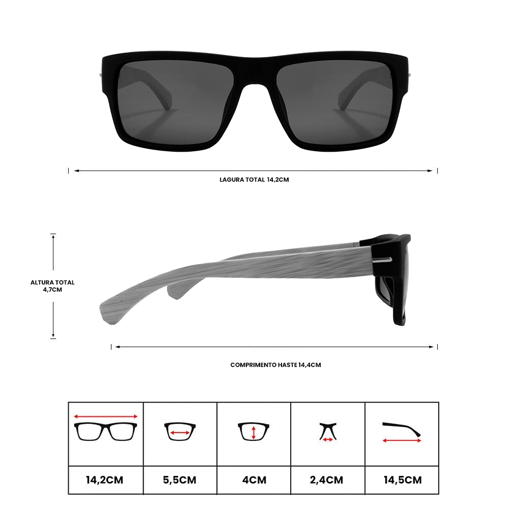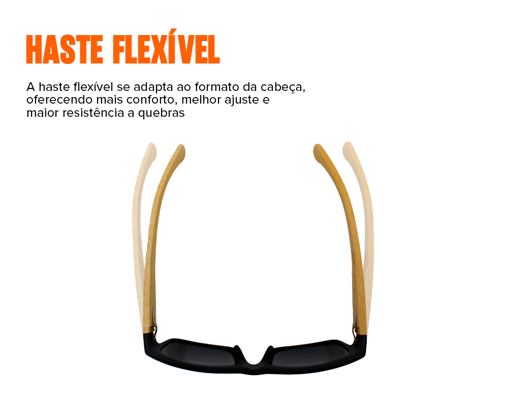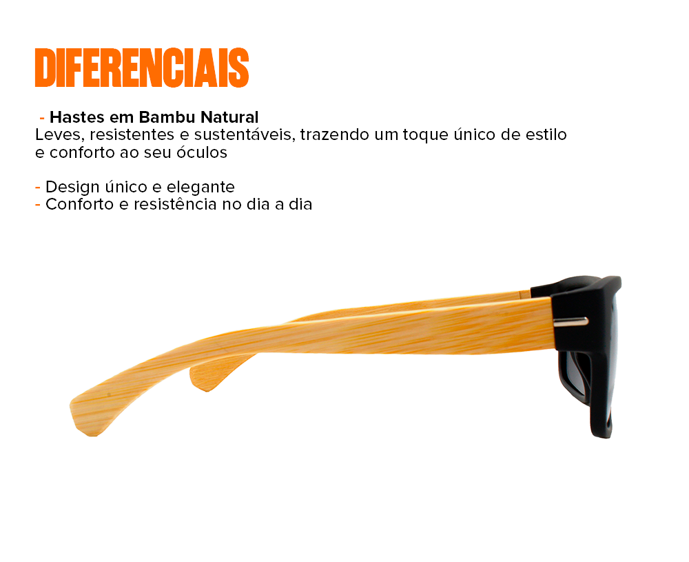 A armação é feita de Acetato e Madeira, e é protegida contra a corrosão.