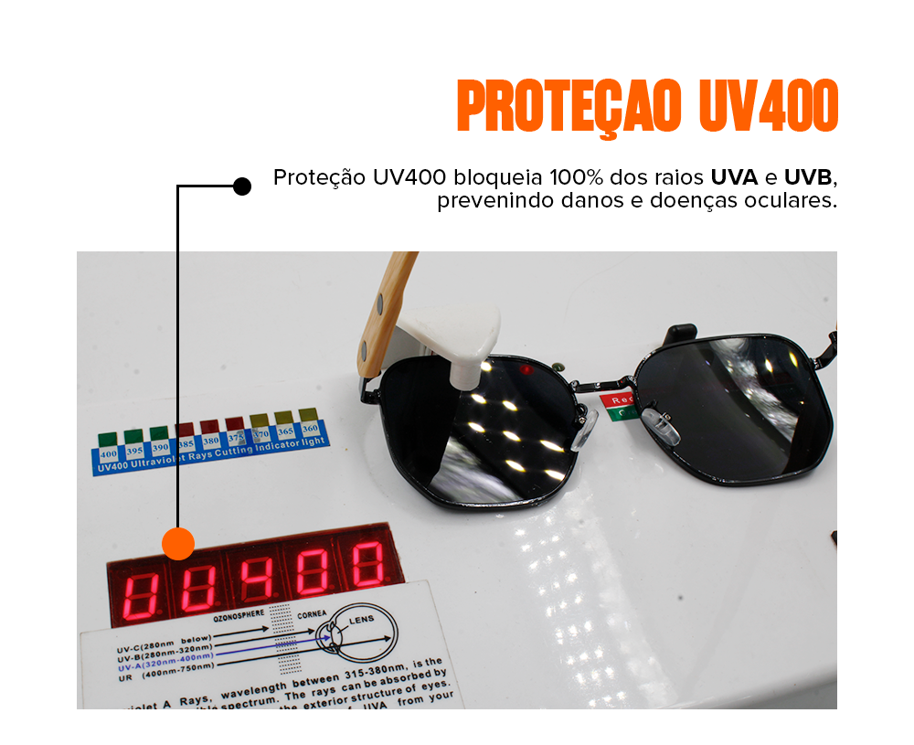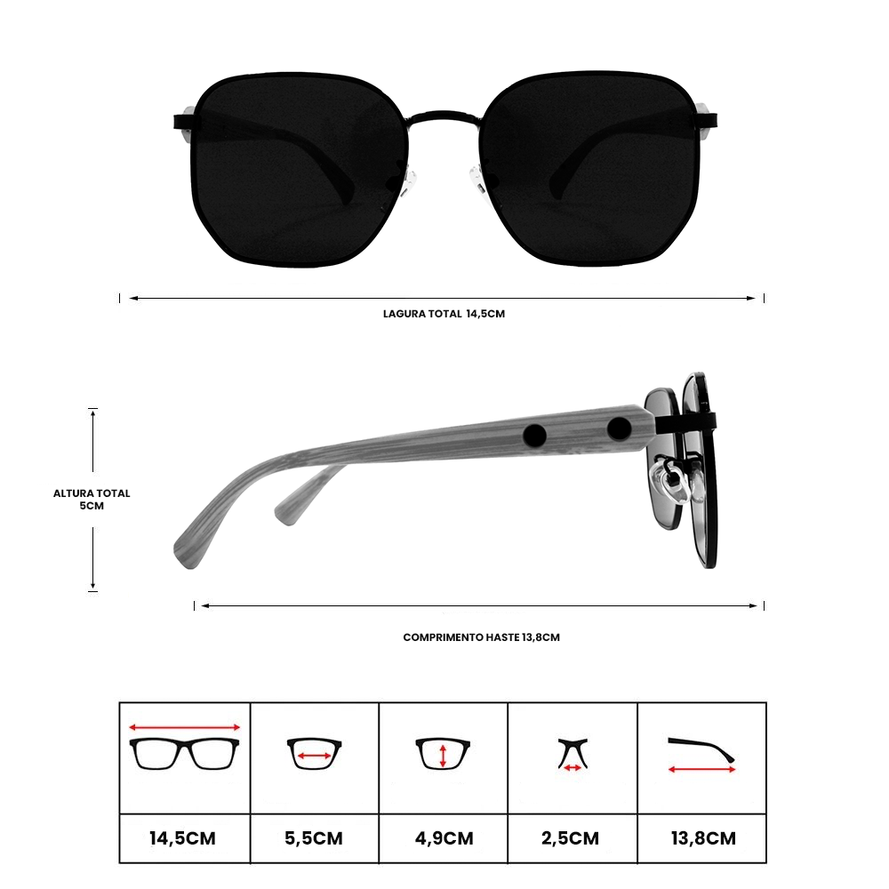 A armação é feita de Acetato e Metal, e é protegida contra a corrosão.