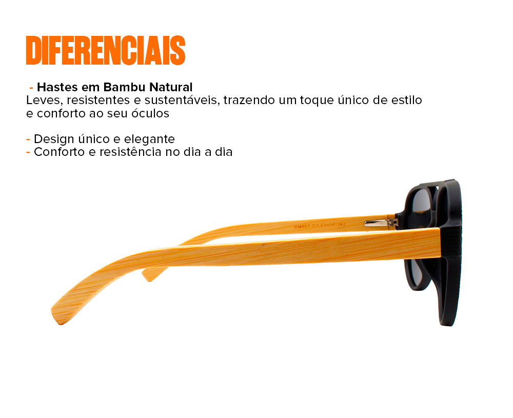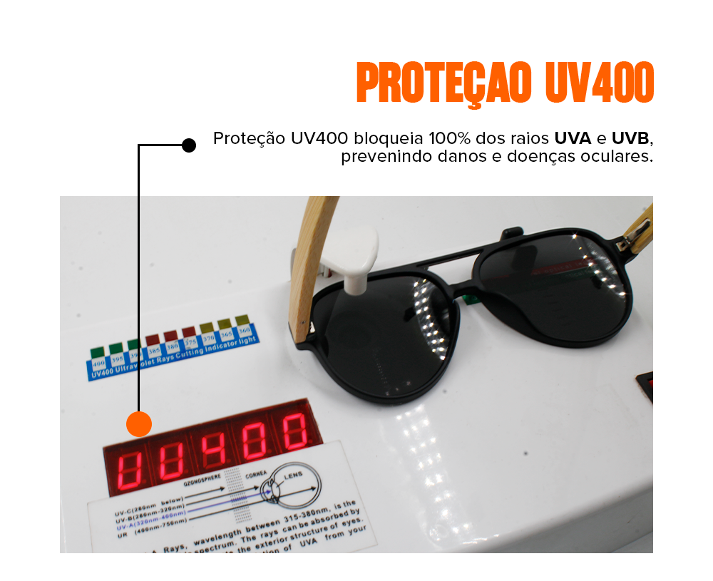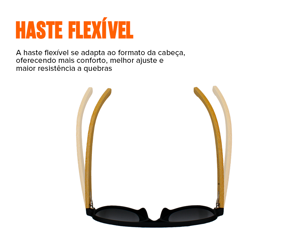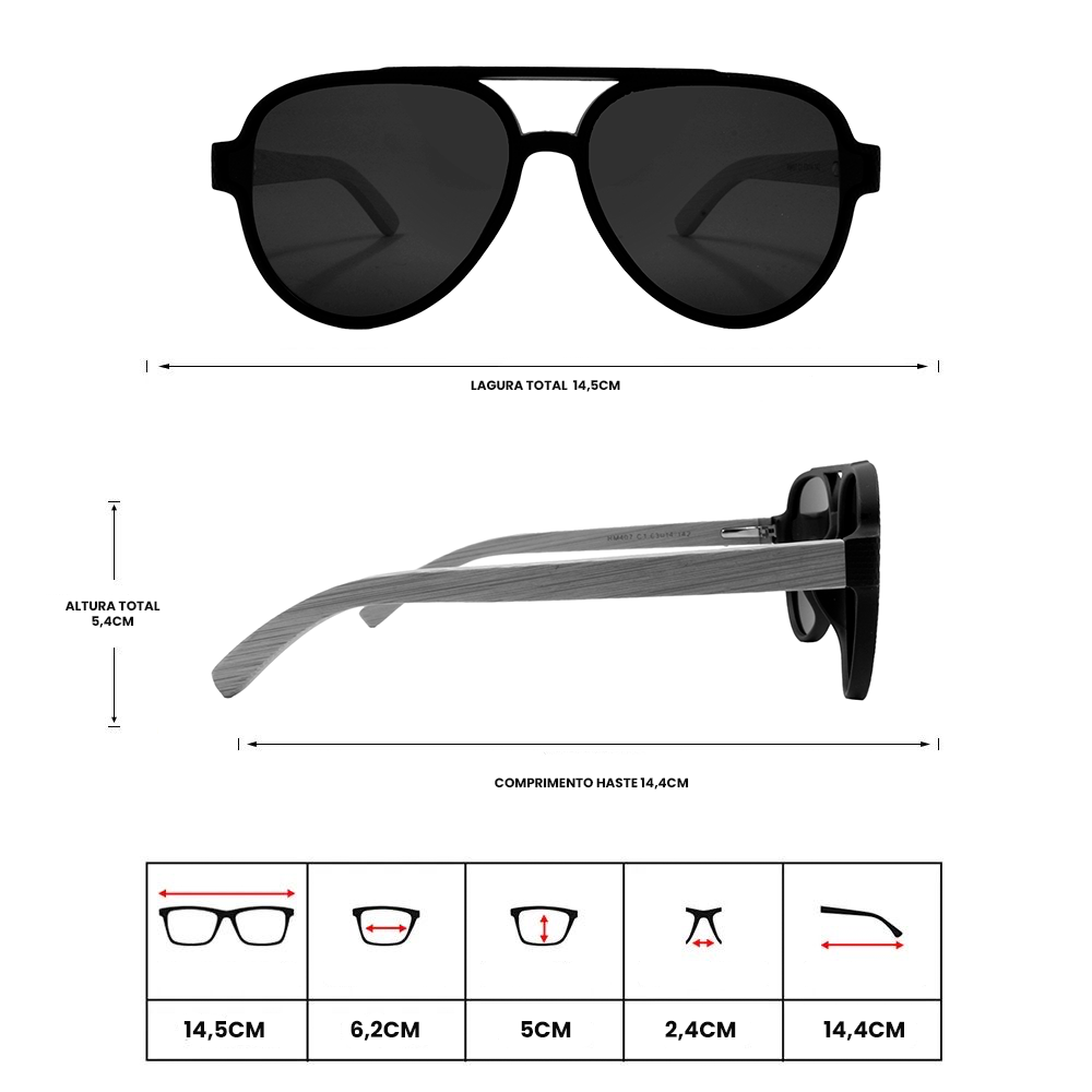 A armação é feita de Acetato e Madeira, e é protegida contra a corrosão.