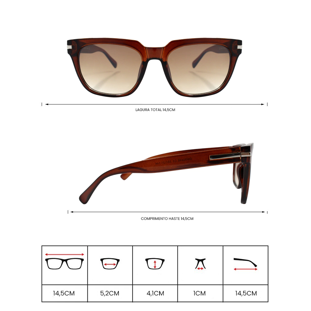 A armação é feita de Acetato, e é protegida contra a corrosão.