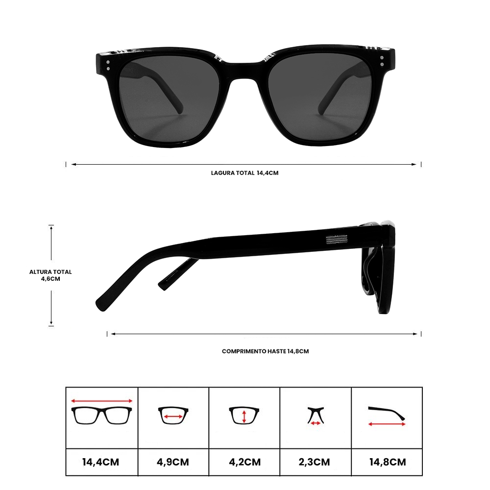 A armação é feita de Acetato, e é protegida contra a corrosão.