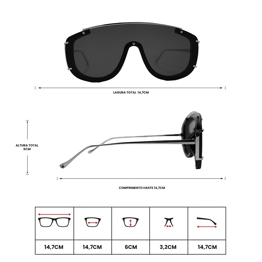 A armação é feita de Acetato e Metal, Material Injetado, e é protegida contra a corrosão.