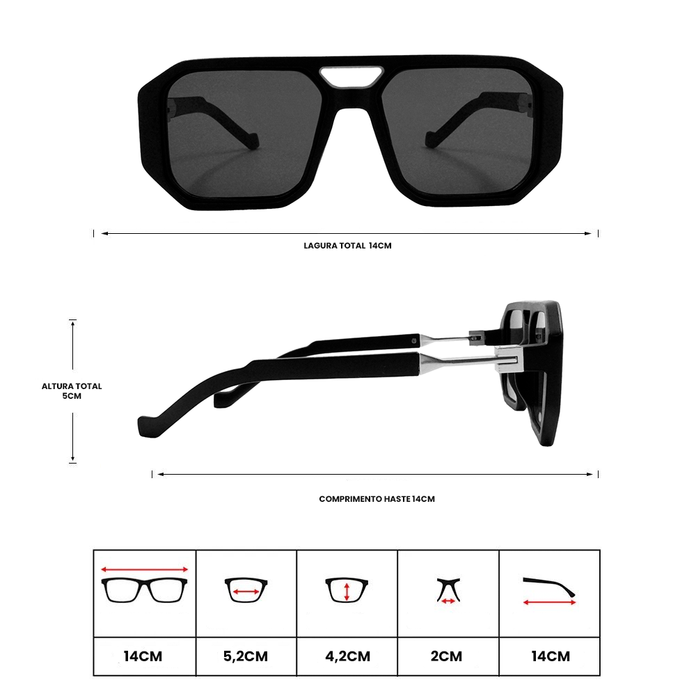 A armação é feita de Acetato, Material Injetado e é protegida contra a corrosão.