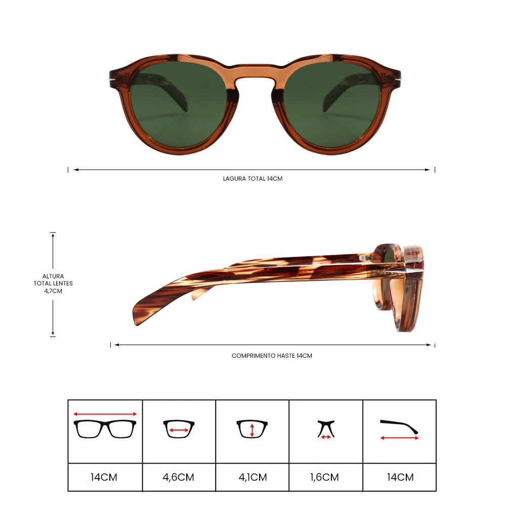 A armação é feita de Acetato, e é protegida contra a corrosão.