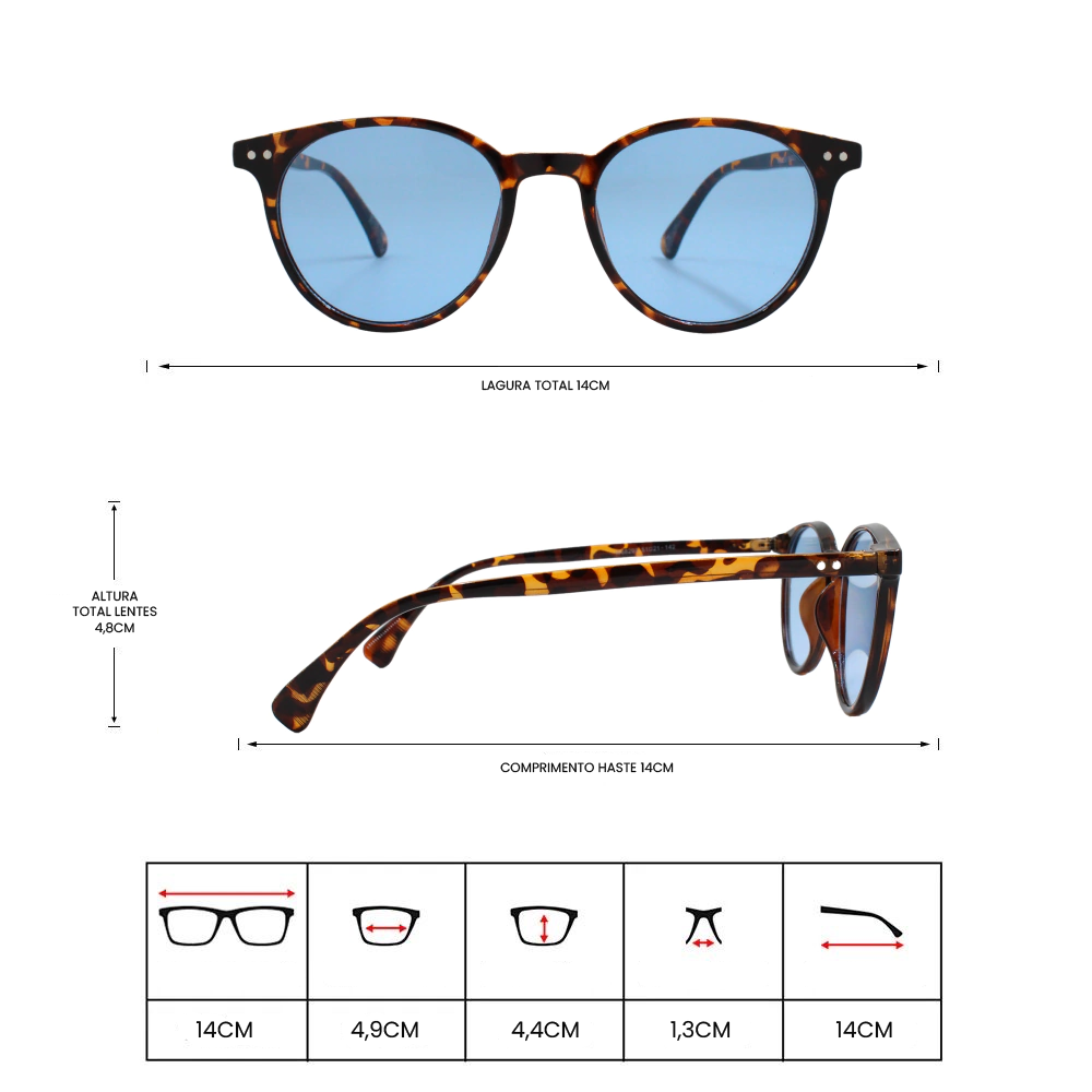 A armação é feita de Acetato, é protegida contra a corrosão.