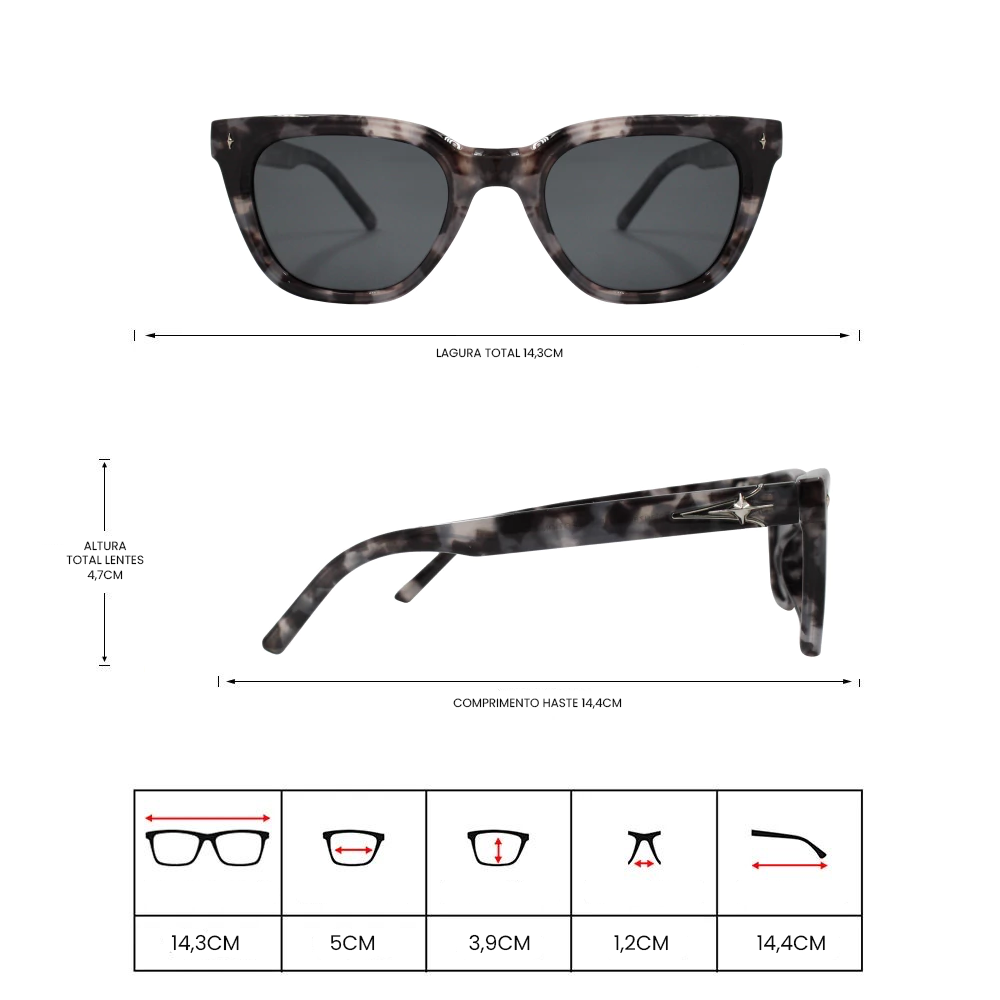 A armação é feita de Acetato, e é protegida contra a corrosão.