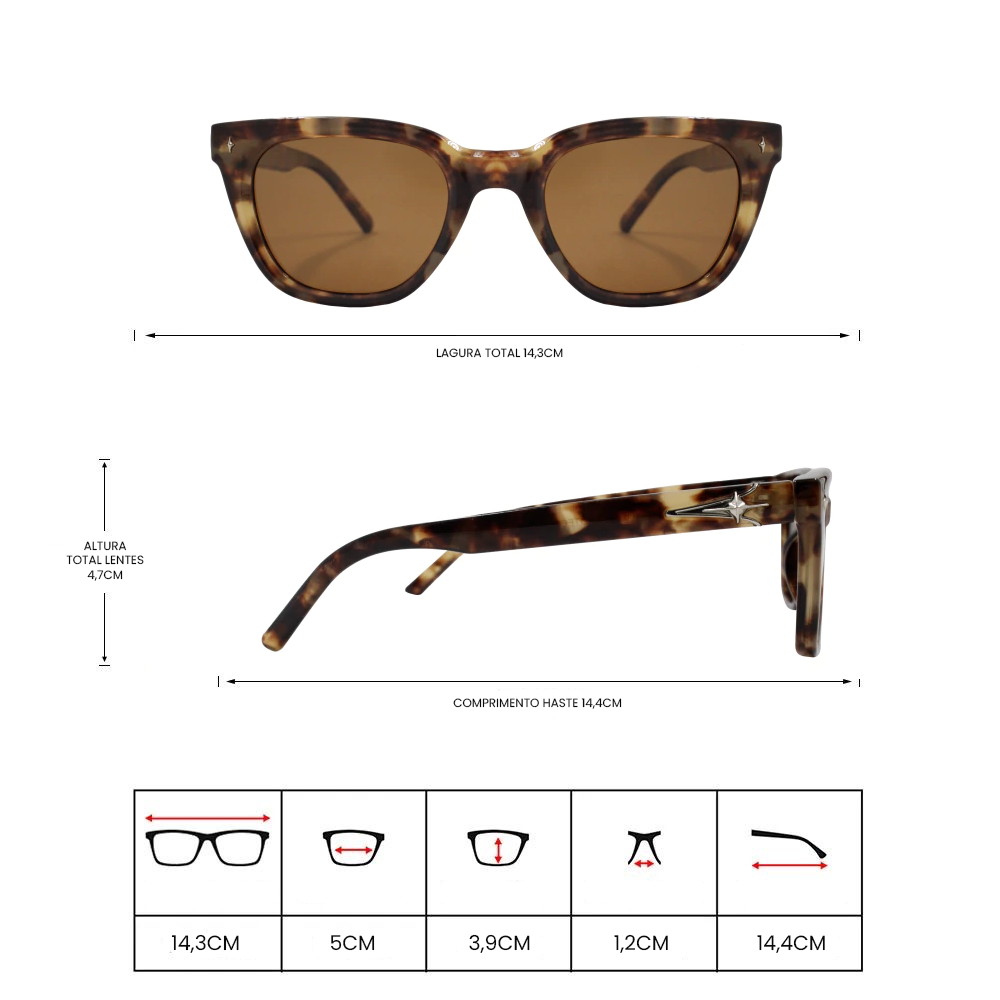A armação é feita de Acetato, e é protegida contra a corrosão.