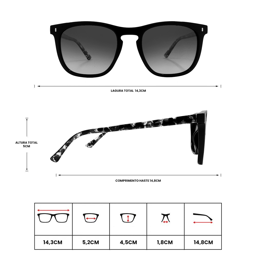 A armação é feita de Acetato, e é protegida contra a corrosão.
