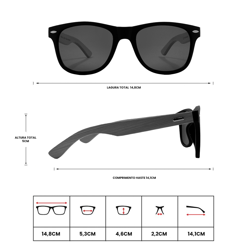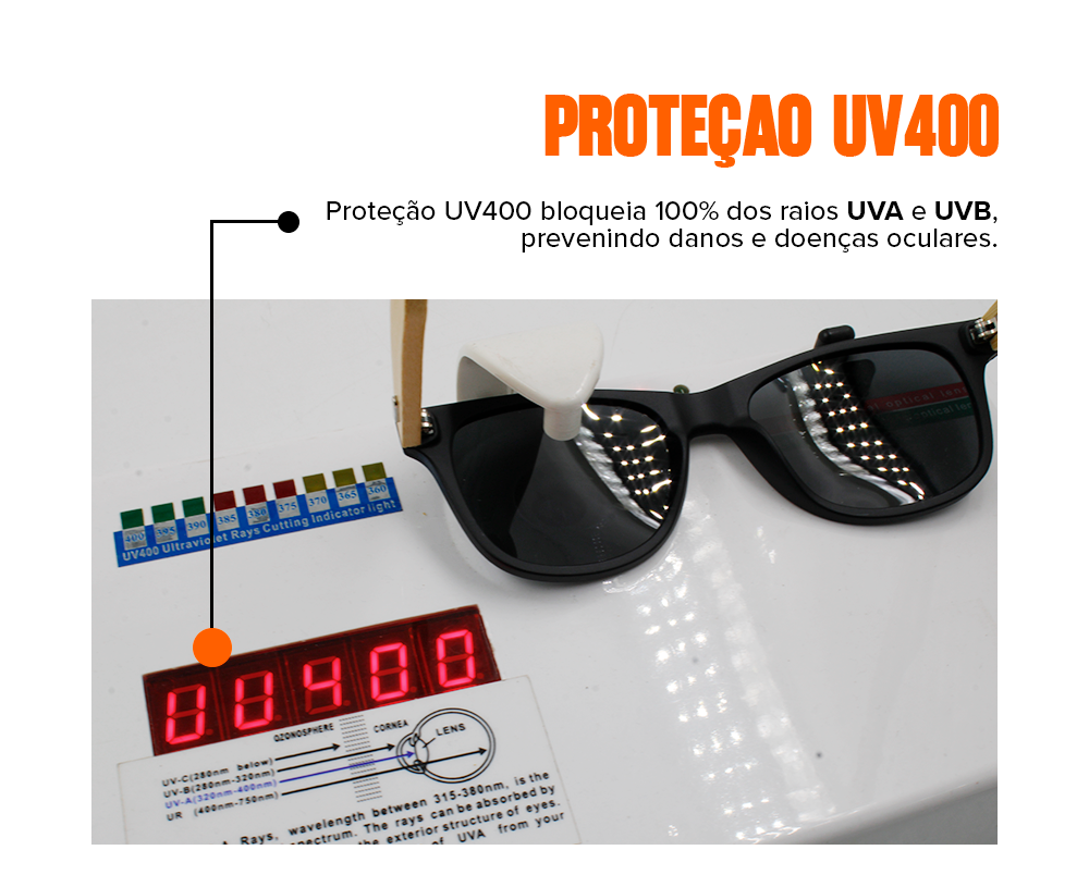 A armação é feita de Acetato e Bambu, e é protegida contra a corrosão.