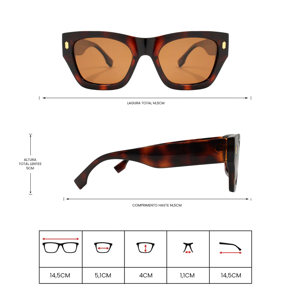 A armação é feita de Acetato, e é protegida contra a corrosão.