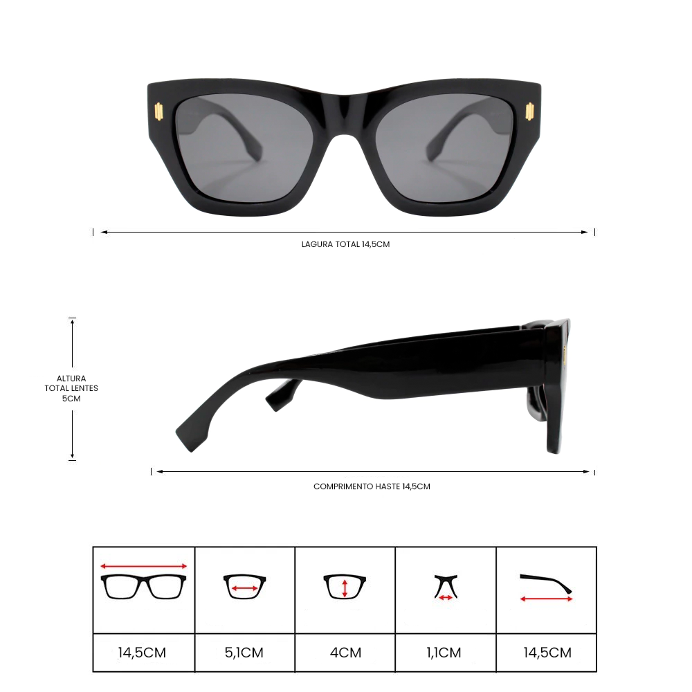 A armação é feita de Acetato, e é protegida contra a corrosão.