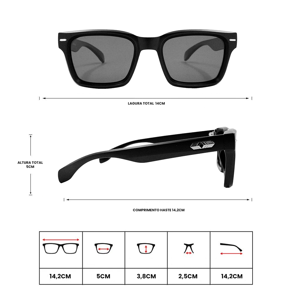 A armação é feita de Acetato, Material Injetado, e é protegida contra a corrosão.