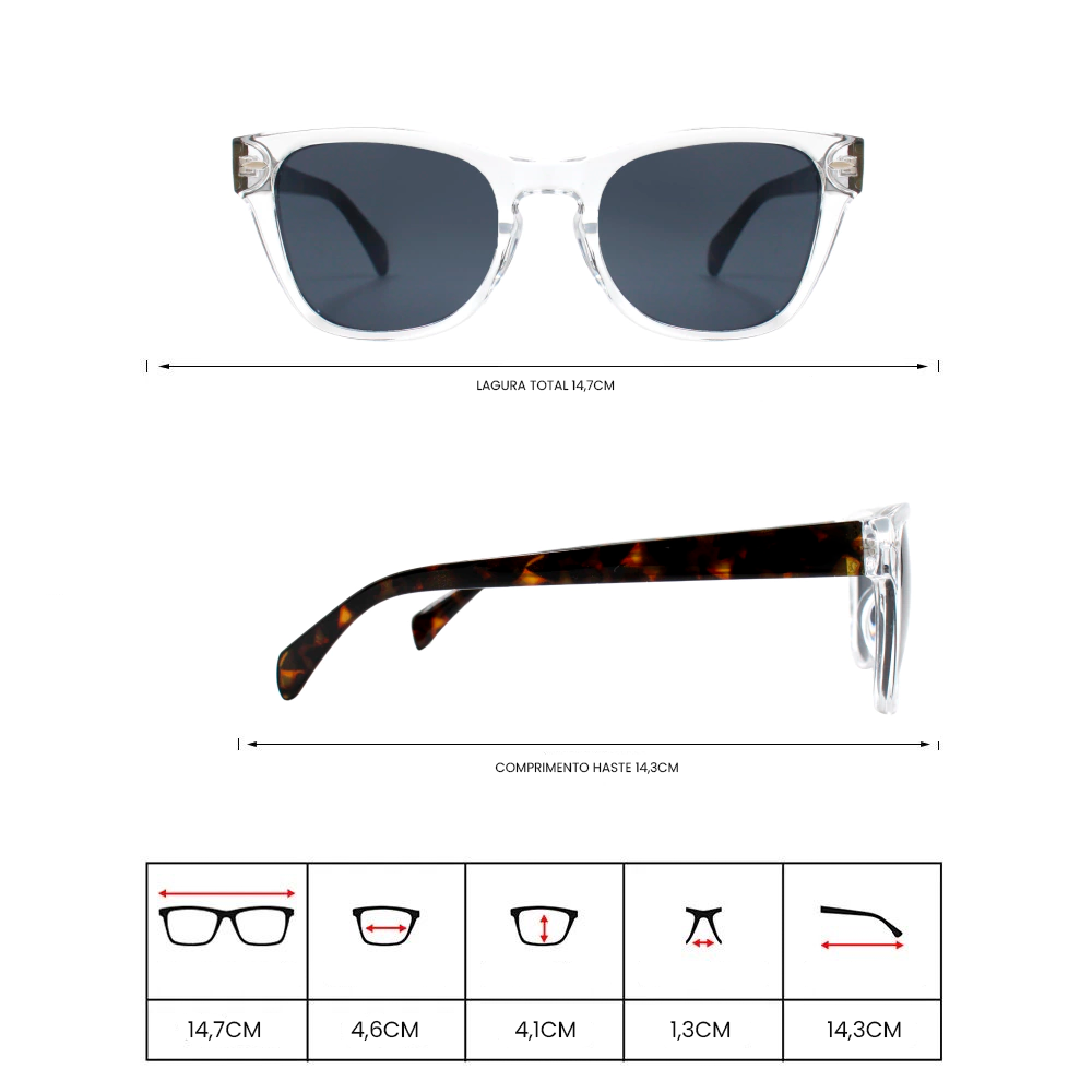 A armação é feita de Acetato, e tem proteção contra corrosão.