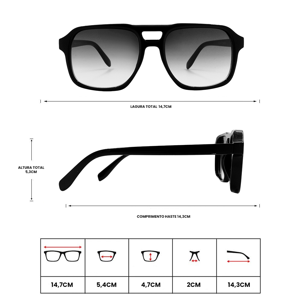 A armação é feita de Acetato, e é protegida contra a corrosão.