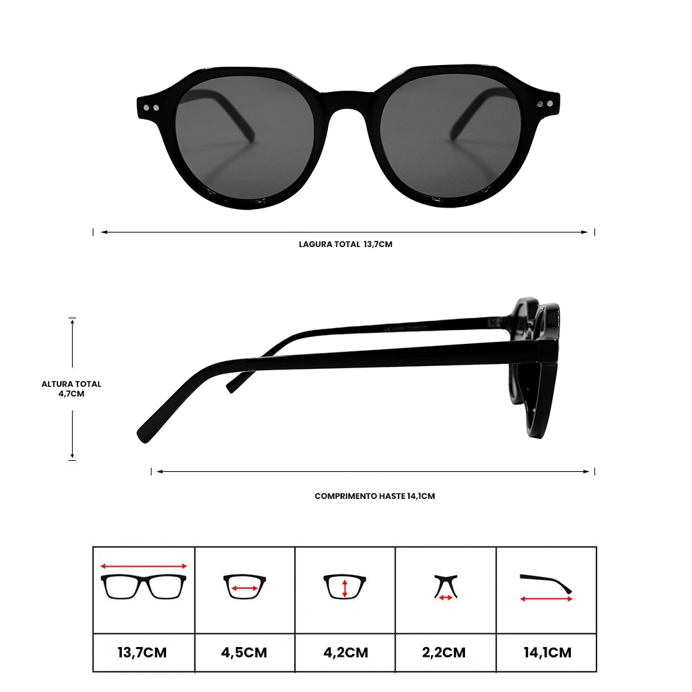 A armação é feita de Acetato, Material Injetado, e é protegida contra a corrosão.