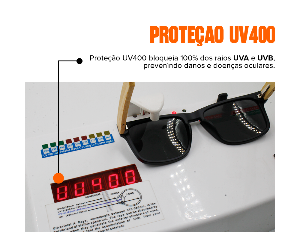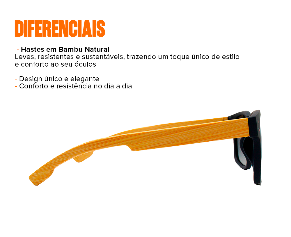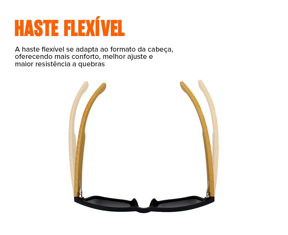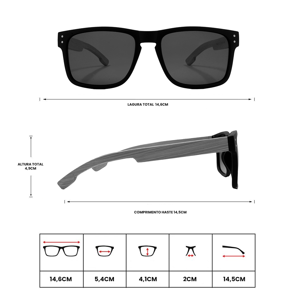 A armação é feita de Acetato e Madeira, e é protegida contra a corrosão.
