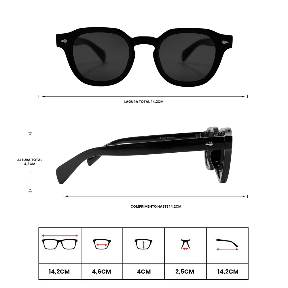 A armação é feita de Acetato, e é protegida contra a corrosão.