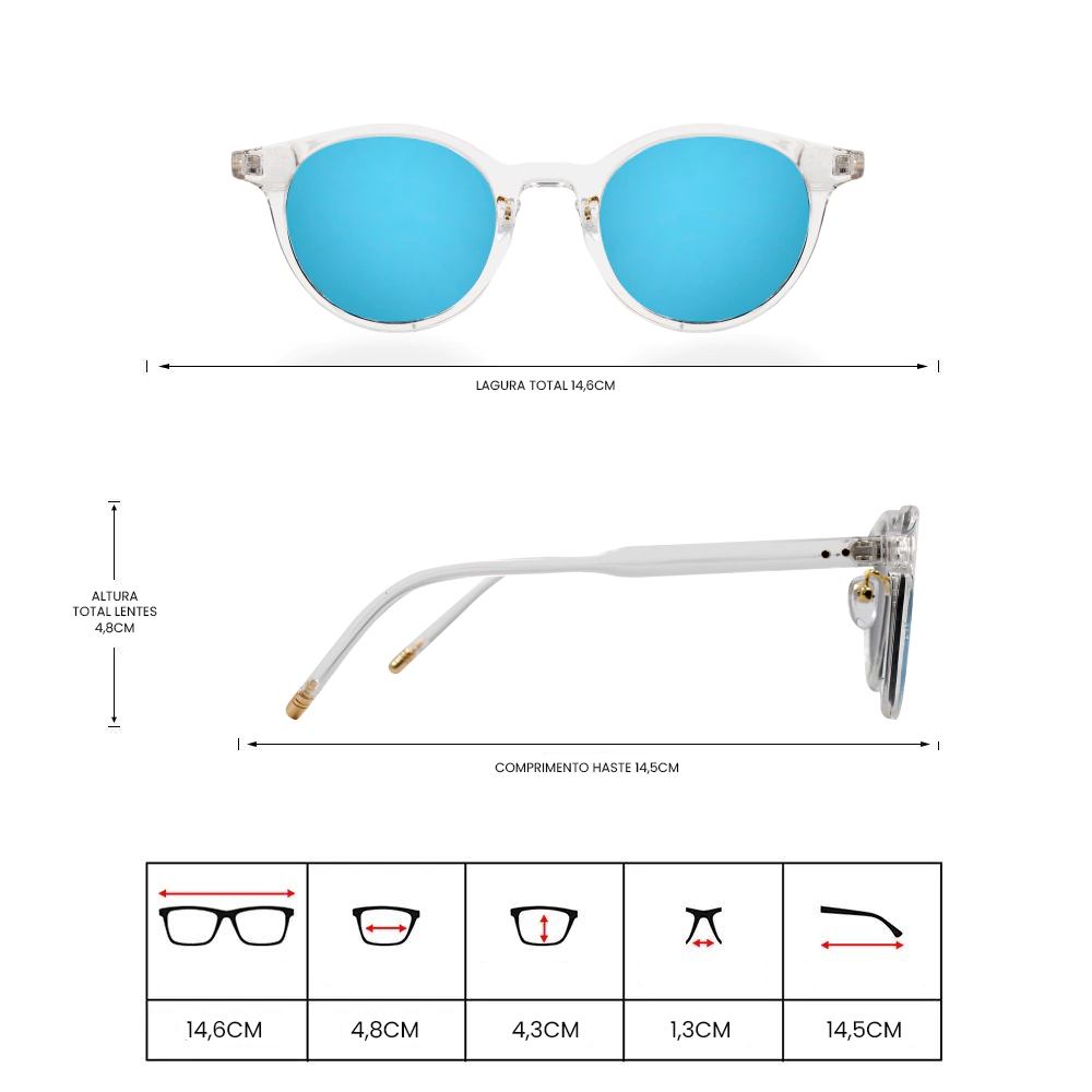 A armação é feita de Acetato, e é protegida contra a corrosão.