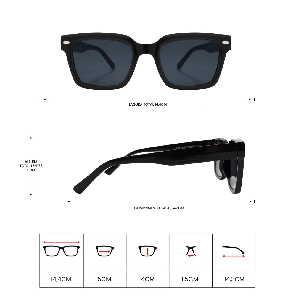 A armação é feita de Acetato, é protegida contra a corrosão.