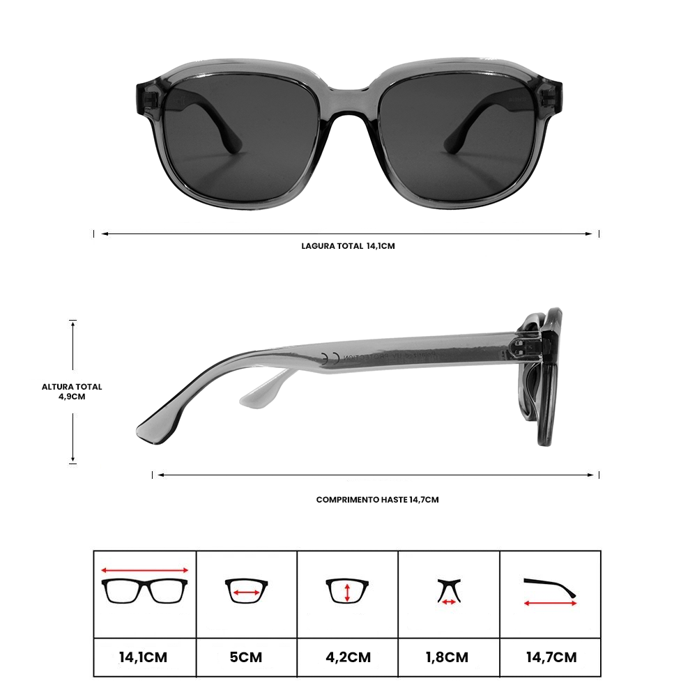 A armação é feita de Acetato, e é protegida contra a corrosão.