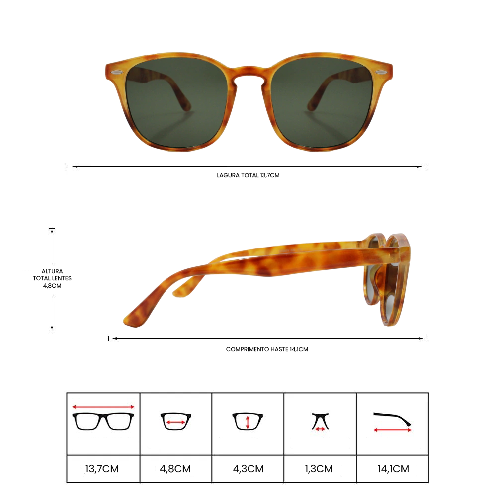 A armação é feita de Acetato, e é protegida contra a corrosão.