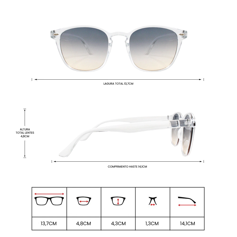 A armação é feita de Acetato, e é protegida contra a corrosão.